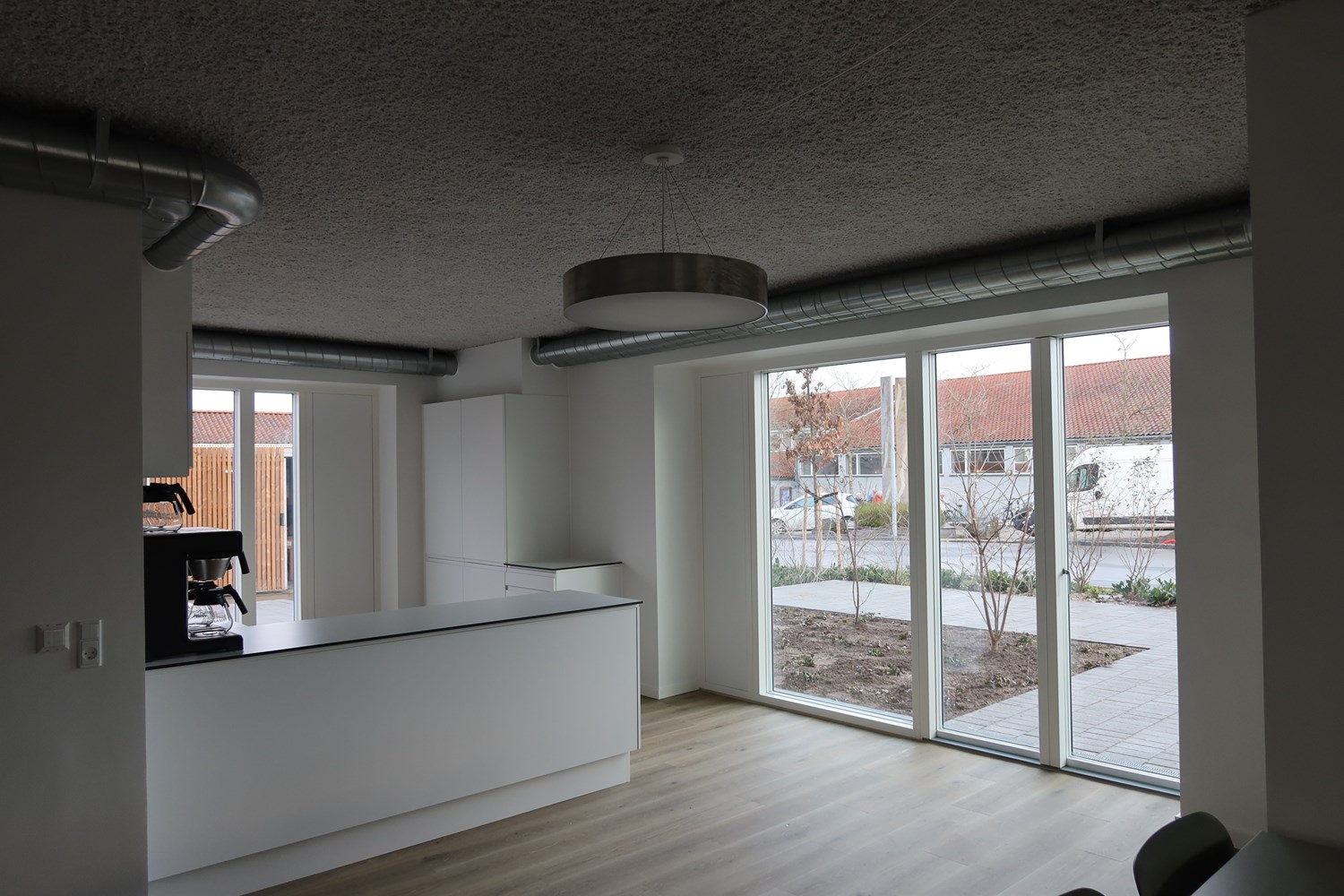 Vi har stået for montering af vinduer, den indvendige aptering samt udførelsen af den store tagkonstruktion og loftet i det overdækkede indgangsparti.